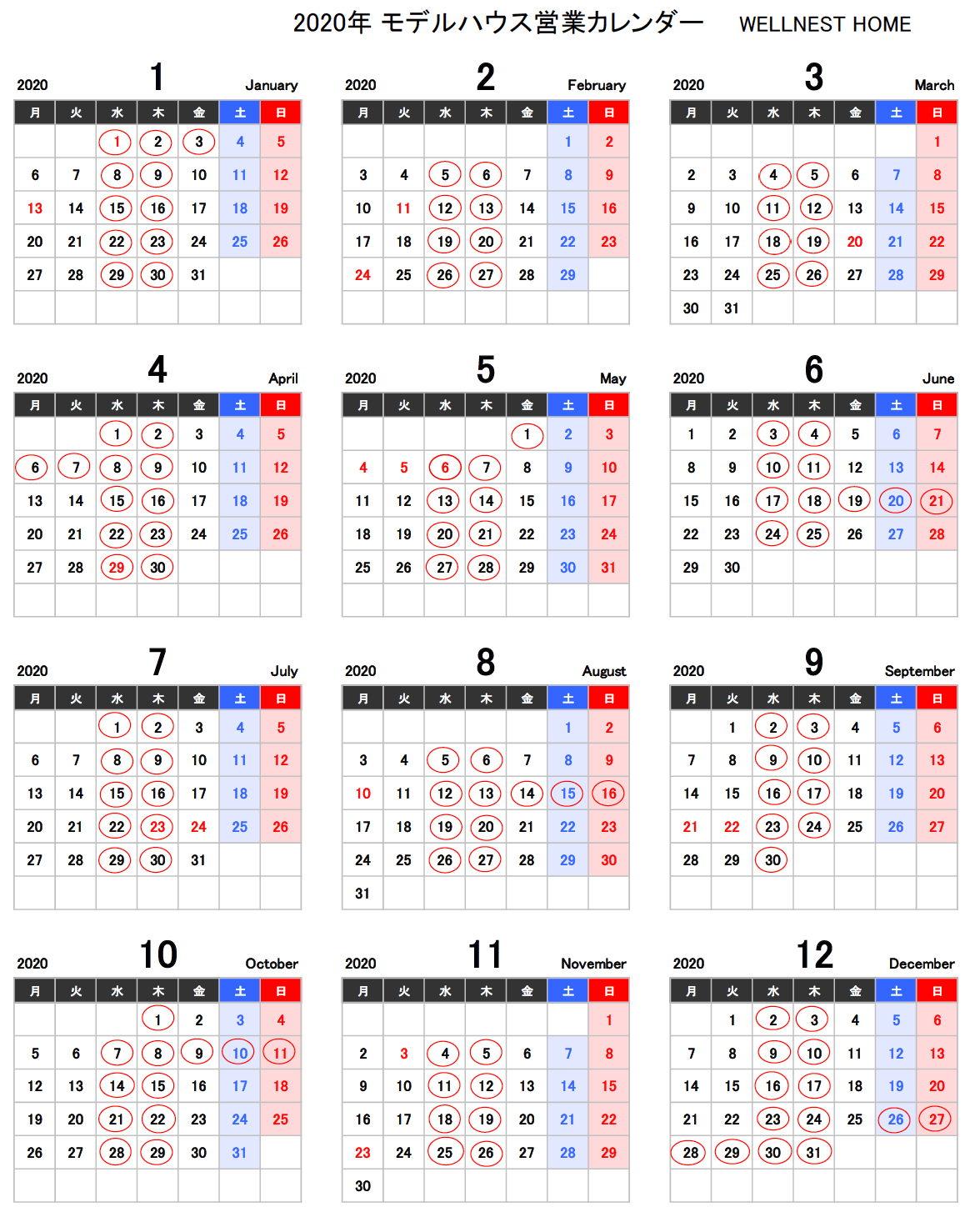 さて、ウェルネストホームでは、2020年におけるモデルハウスの営業日を、下記のカレンダーの通り定めさせていただいております。