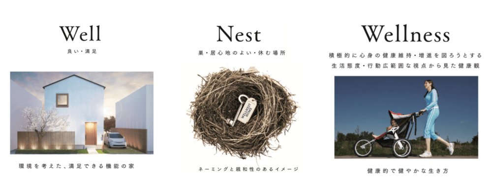 WELLNEST とは WELL「良い」と NEST「巣」、WELNESS「健康であり続ける」を合わせた造語です。健康的な良い巣作りを応援したいという想いを込めた社名 です。ロゴマークでは、造り⼿である職⼈の⼿と家をイメージしています。WELLNEST HOME でのこだわりである空気感を体感頂くために、宿泊体験型モデルハウスをご⽤意しています。(宮城・千葉・愛知・⼤阪・⾹川)